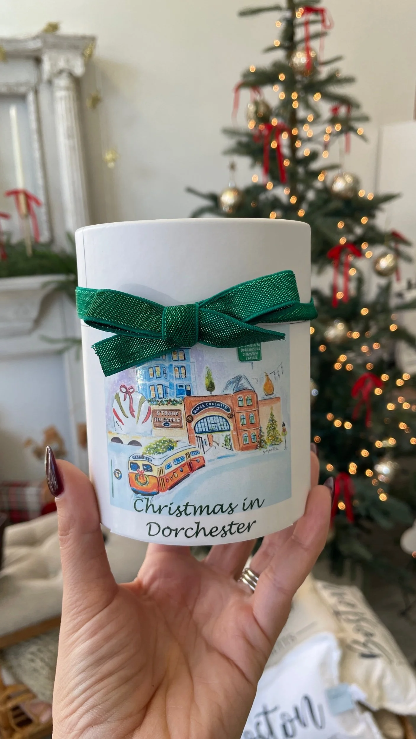 9 oz candle, white frosted glass jar in a white paper tube complete with a festive bow for both sizes. No wrapping required! This is the perfect gift for anyone whose heart is in Dorchester this Christmas.